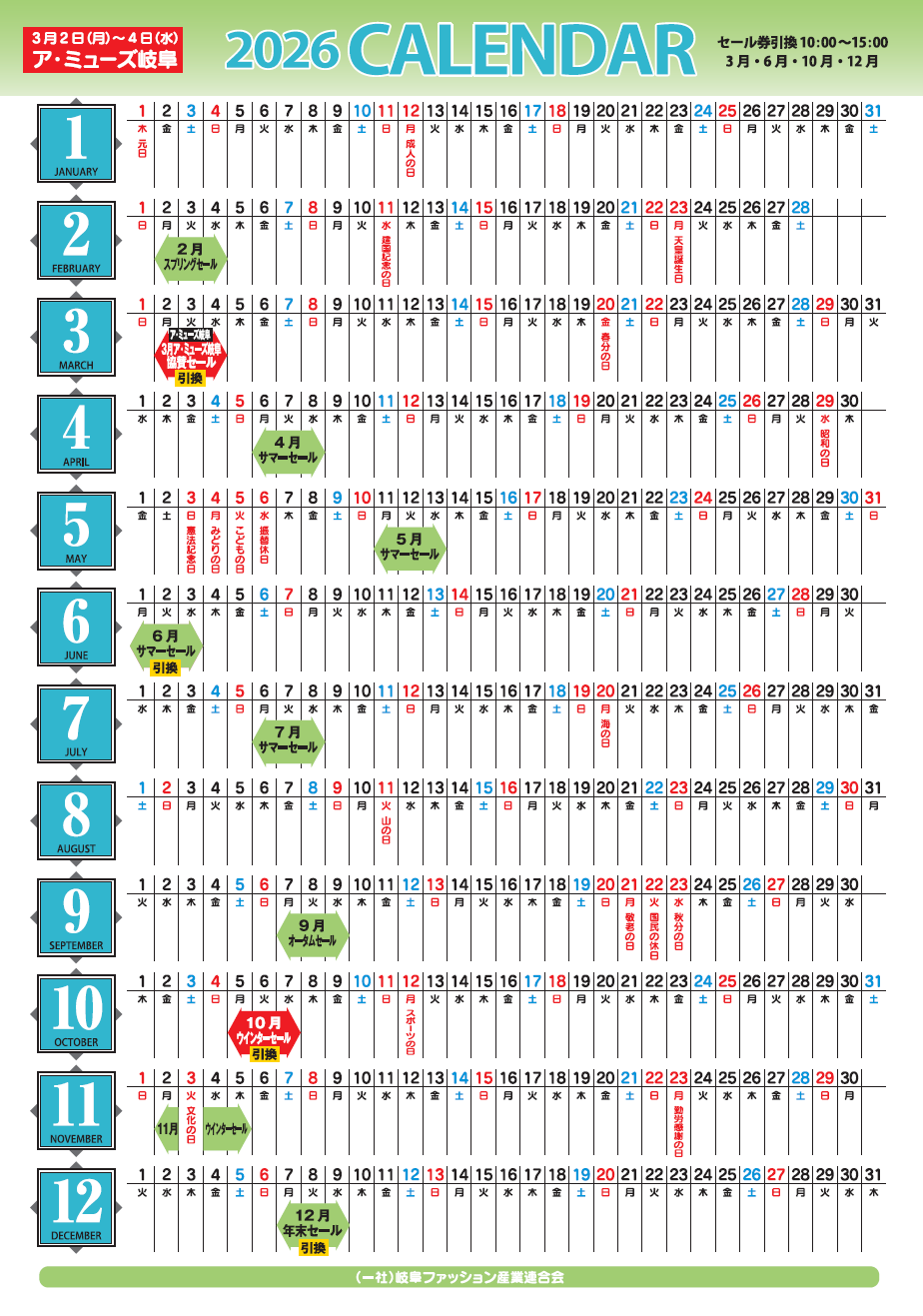 主な行事カレンダー 主な行事カレンダー 2025年 連合会カレンダー ←新年度のカレンダーのPDFデータをご覧頂けます。(下記表示カレンダー)2024年 連合会カレンダー ←カレンダーのPDFデータをご覧頂けます。 令和8年 (2026年) イベント・スケジュール 2月 3月 3月ア・ミューズ協賛セール 3月2日〜4日 4月 4月サマーセール 4月6日~8日 春のせんい祭 4月5日 5月 5月サマーセール 5月11日~13日 6月 6月サマーセール 6月1日~3日 7月 7月ラストサマーセール 7月6日~8日 夏のせんい祭 8月 ーーーーーーーーーーーーーーーーーーーーーーーーーー 9月 9月オータムセール 9月7日~9日 10月 10月ウィンターセール 10月5日~7日 秋のせんい祭 10月4日 11月 11月ウィンターセール 11月2日~5日 12月 12月年末特別セール 12月7日~9日 冬のせんい祭 12月6日